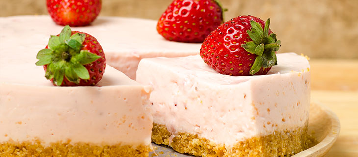 4. Un-moulding and topping: Bring the cheesecake to room temperature, about 30 mins before serving. To un-mould, place the base on top of a can, then gradually pull the sides of the tin down. Slip the cake onto a serving plate, removing the lining paper and base. Purée half the 400g punnet strawberries in a blender or food processor with 25g icing sugar and 1 tsp water, then sieve. Pile the remaining strawberries onto the cake, then pour over purée.