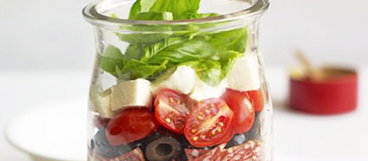 Method Cook the pasta following pack instructions. Drain, rinse under cold water to cool, then drain well. Toss with the oil and sundried tomato pesto, season to taste. Place in a jar or plastic box and scatter over the remaining ingredients in layers, ending with the basil. Source: bbcgoodfood