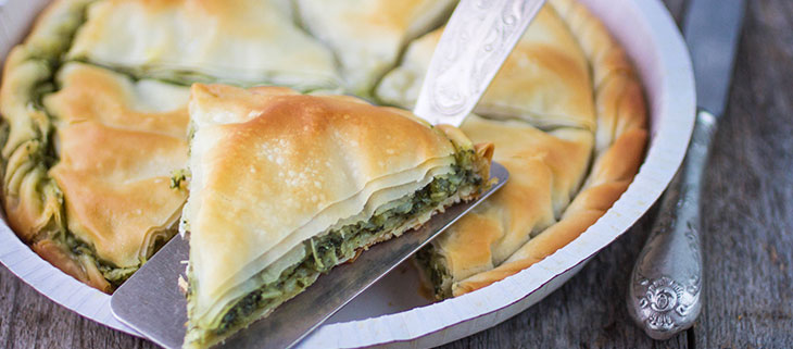 Directions Mix the spinach, feta, dill, parsley, green onions, eggs, salt and pepper in a large bowl. Brush the bottom of an 22cm baking pan with olive oil. Brush the top of a sheet of phyllo dough with olive oil and place it in the pan. (You may have to... Read More